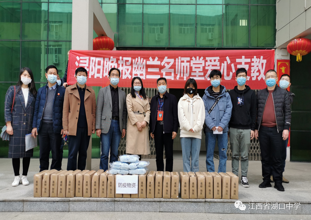 当前,疫情防控形势向好,湖口中学正紧锣密鼓做好迎接初三高三学生返校复学准备工作。4月3日,九江日报社旗下的浔阳晚报幽兰名师堂携手九江中招君走进湖口中学,为学校捐赠了500个医用口罩,250斤消毒水,助力学校抗击“疫”情。