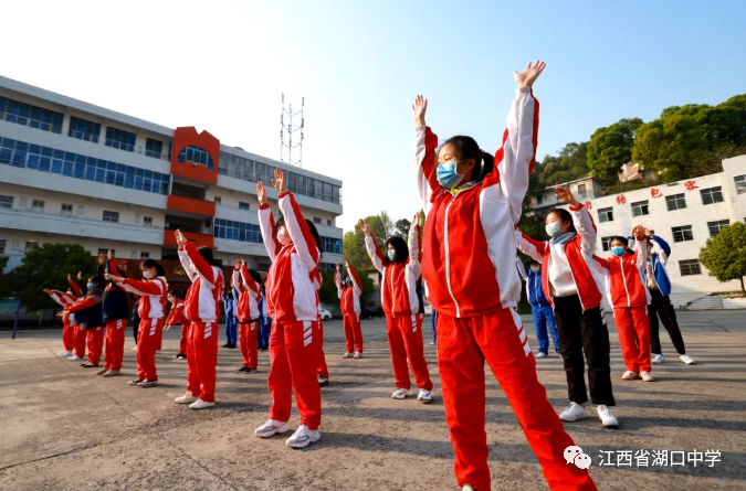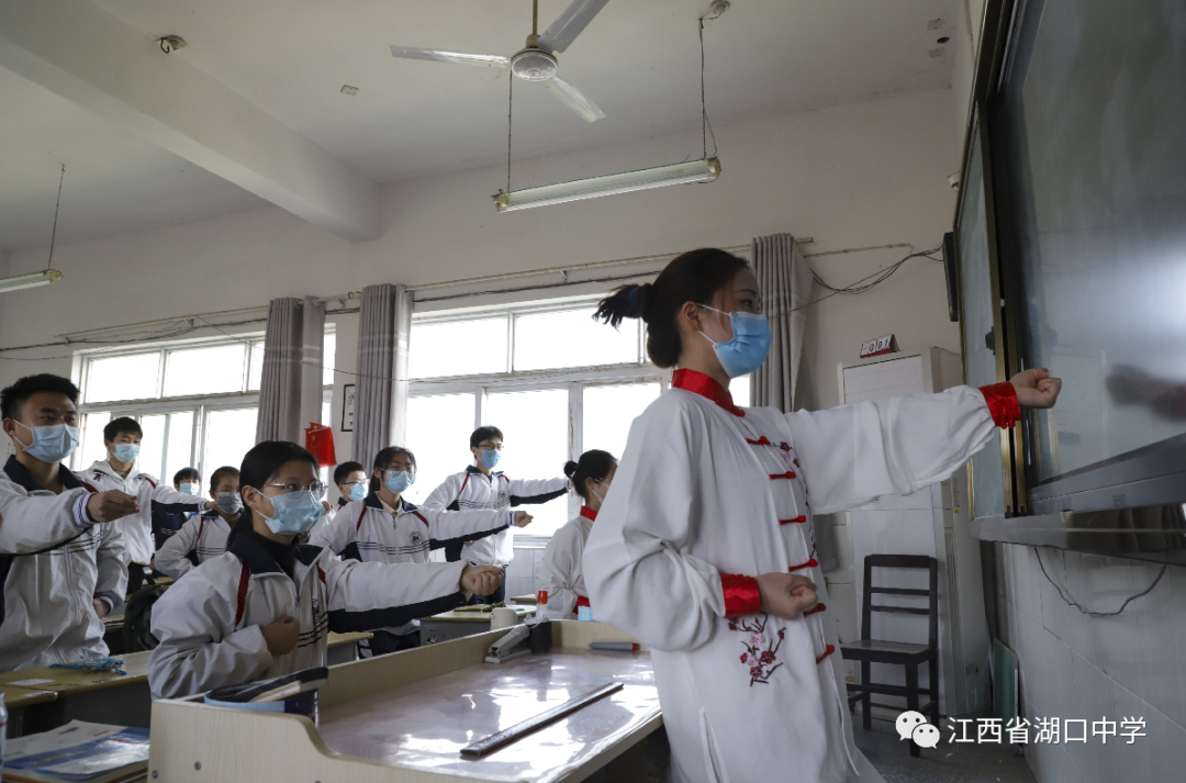 学生课间活动期间,湖口县中医医院医护人员来到高三年级指导师生进行健身功法“六段锦”锻炼,帮助大家提高抗病能力,舒缓精神压力。