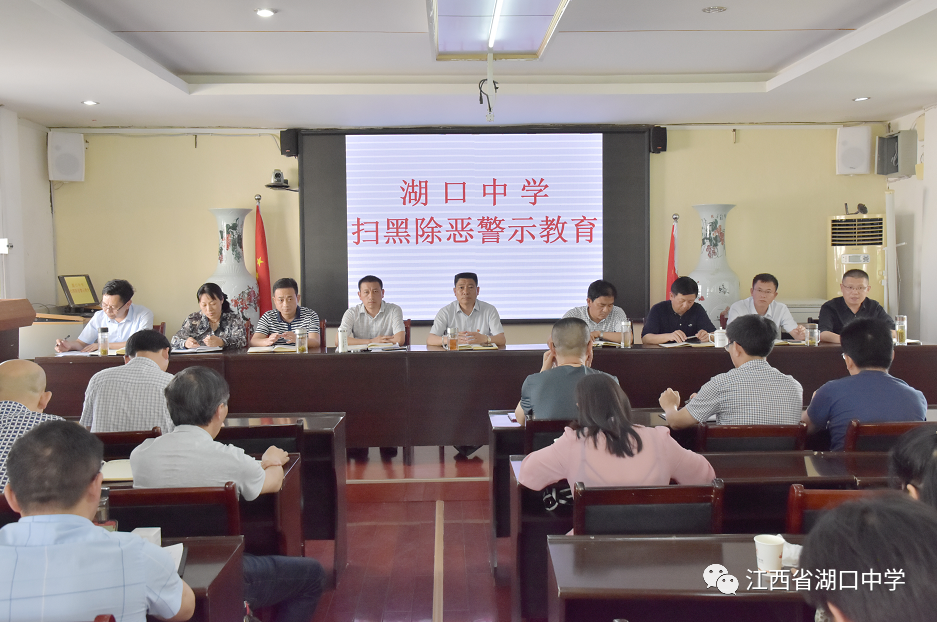5月18日下午,湖口中学召开了“扫黑除恶”警示教育会,对“扫黑除恶”警示教育工作和学校安全工作进行再强调。全体党员干部参加会议。会议由副校长涂新满主持。 会议组织大家观看了湖口县“扫黑除恶”警示教育宣传片,通过湖口县涉黑涉恶腐败及“保护伞”案例,对与会人员进行警示教育,要求大家汲取教训,以案为鉴,自觉做到知敬畏、明底线,切实增强行动自觉。 校长殷秀生强调,要从“身边事、身边人”的警示教育中总结教训,广泛深入宣传学习习总书记关于“扫黑除恶”专项斗争和依法治国的讲话精神,把“扫黑除恶”斗争同平安校园建设相结合,为广大师生创造良好的校园环境,保障学生安全。 校党总支书记、副校长周国勇要求,要切实提高政治站位,认清当前“扫黑除恶”形势,以此为契机,认真梳理并排查学校及周边扰乱教育教学秩序的涉黑、涉恶、涉乱线索。(办公室)